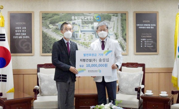 충북대학교병원(병원장 최영석)은 송성섭 지평건설㈜ 대표(사진 왼쪽)가 병원발전후원금 1천만 원을 전달했다고 2일 밝혔다.